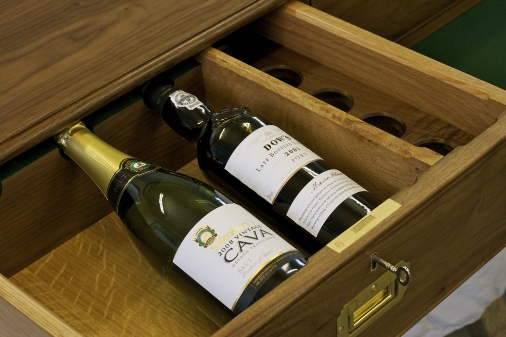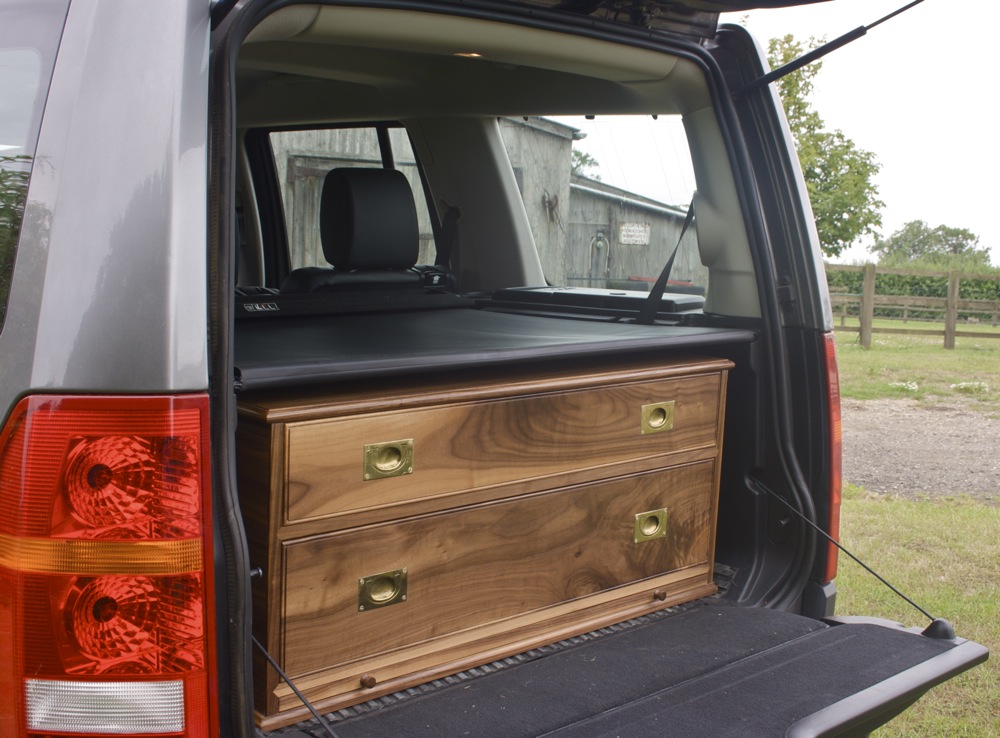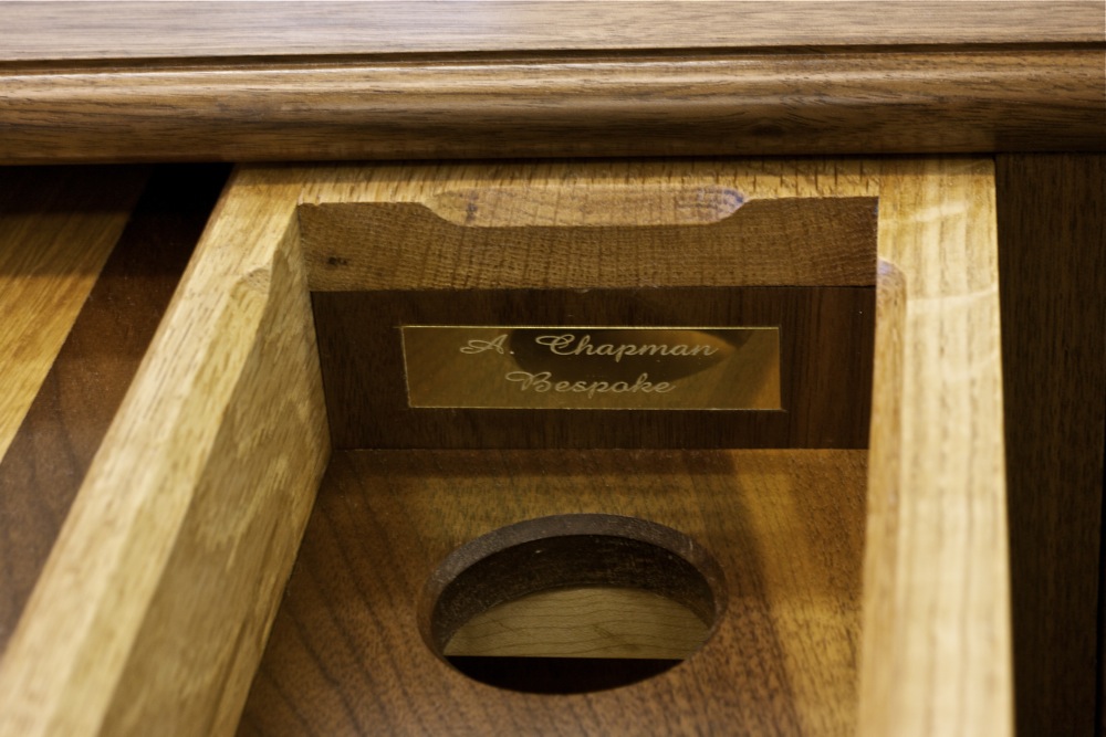 This boot chest offers a lot of gun storage with three large compartments in the base drawer for cartridges and two to four rifles. It is made in solid Canadian maple inside with solid black walnut drawer fronts. it has hidden locks for both drawers and a pull out green felt cleaning/service table. Finished in oil and finally waxed its period features really stand out.
